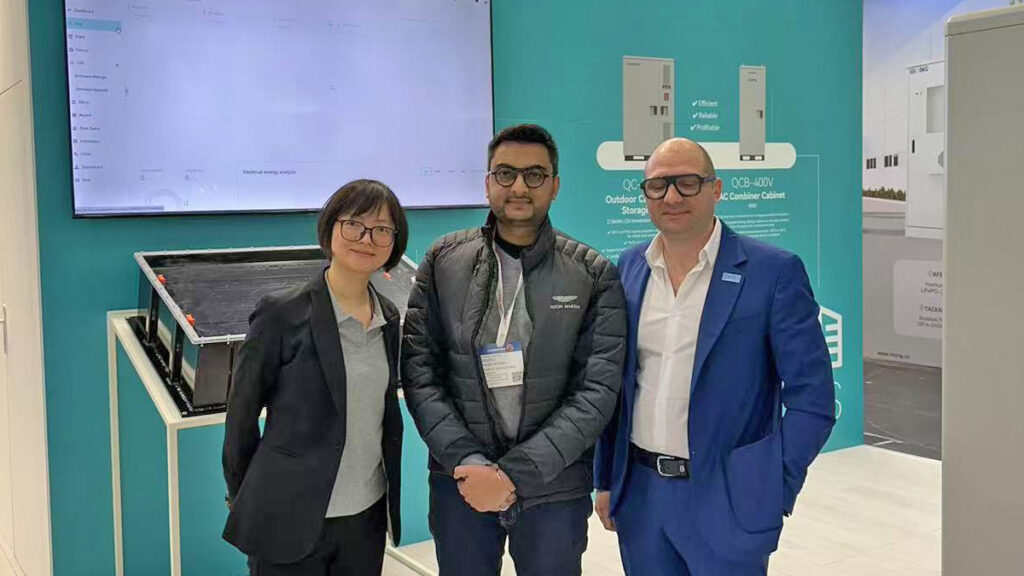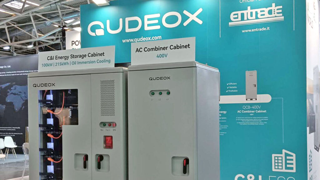 Qudeox participated for the second consecutive year in the international fair The Smarter E Europe 2025 – EES Europe section – held from May 7 to 9 at Messe München, Munich (Germany). At the stand we presented our equipment for Commercial & Industrial Energy Storage Systems: our Outdoor Cabinet Energy Storage System (215kWh), model QC-215K-O —featuring a replica of LFP’s internal batteries with its Oil Immersion Battery Safety System—, and our Static Transfer Switch (STS) Cabinet (400V), model QCB-400V.